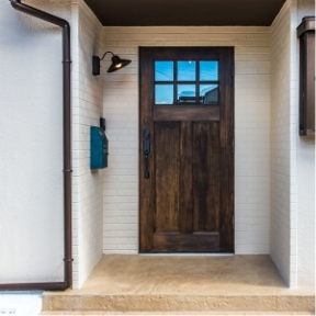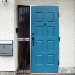 既存のドアをベースに70年代不動産のイメージカラーとも言えるブルーのペイントで仕上げた玄関ドアです。新品にない趣あるデザインが魅力です。