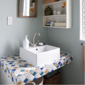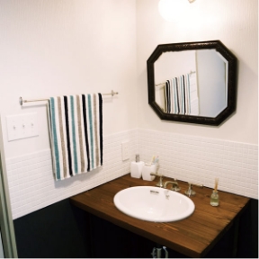 レトロなデザインのタイルとシンプルでスクエアな洗面ボウルの組み合わせ。清潔感の中に遊び心ある技ありな洗面。